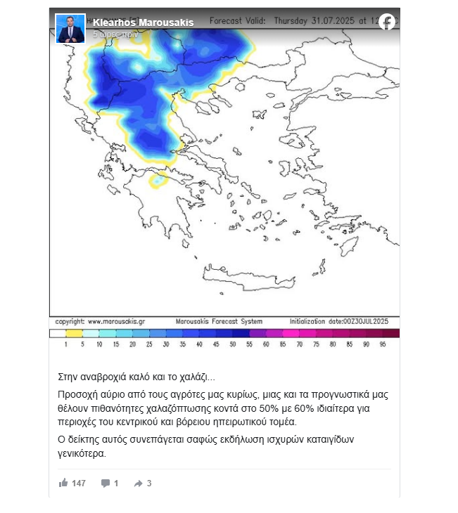 Mάλιστα, ο μετεωρολόγος Κλέαρχος Μαρουσάκης, προειδοποιεί με ανάρτησή του τους αγρότες για έντονα και καταστροφικά σε κάποιες περιοχές καιρικά φαινόμενα.