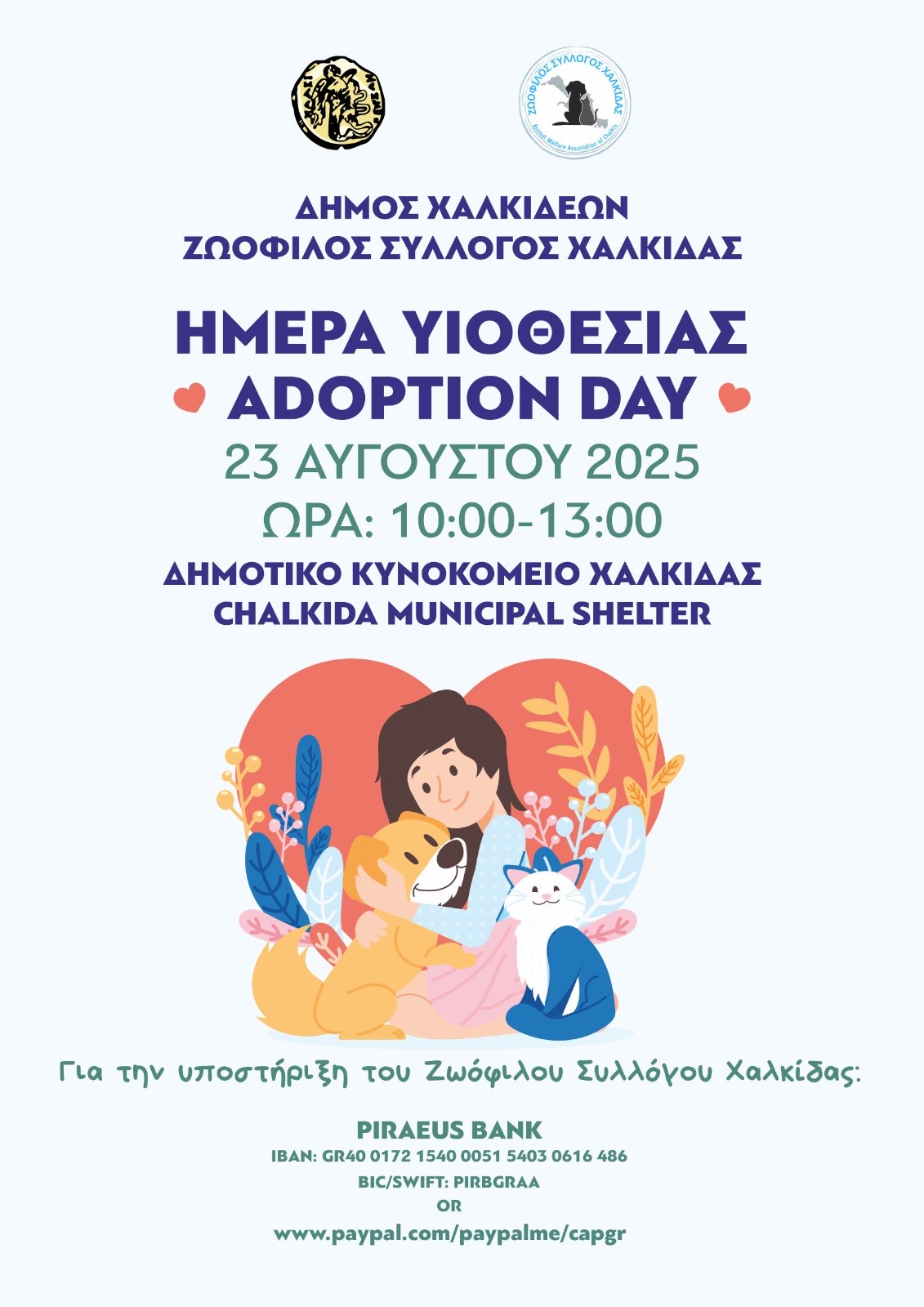 Το Σάββατο 23 Αυγούστου 2025, από ώρα 10:00 έως ώρα 13:00, το Δημοτικό Καταφύγιο Χαλκίδας υποδέχεται την «Ημέρα Υιοθεσίας» και όλους, όσοι επιθυμούν να γνωρίσουν από κοντά τα φιλοξενούμενα ζώα που αξίζουν μια δεύτερη ευκαιρία και μια οικογένεια.