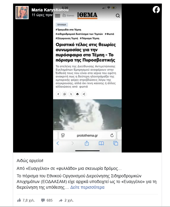 Την οργισμένη αντίδραση της Μαρίας Καρυστιανού προκάλεσε η δημοσιοποίηση του πορίσματος της Πυροσβεστικής για το δυστύχημα των Τεμπών, στο οποίο αναφέρεται