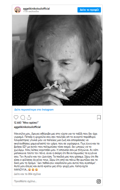 Η Αγγελική Νικολούλη θρηνεί για την απώλεια της μητέρας της, η οποία έφυγε από τη ζωή το Σάββατο 1η Νοεμβρίου, έπειτα από μακρά