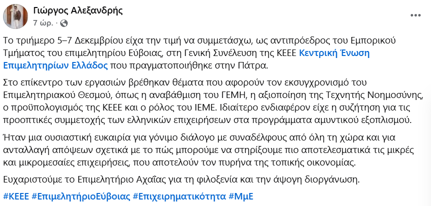 Το τριήμερο 5-7 Δεκεμβρίου, ο Αντιπρόεδρος του Εμπορικού Τμήματος του Επιμελητηρίου Εύβοιας, Γιώργος Αλεξανδρής, συμμετείχε στην Γενική Συνέλευση Κεντρικής Ένωσης Επιμελητηρίων Ελλάδας στην Πάτρα.