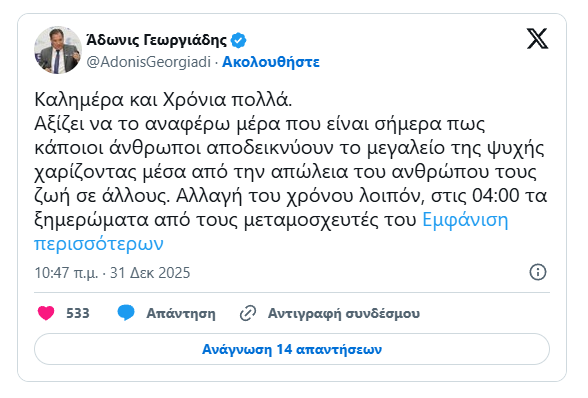 Ο Υπουργός Υγείας, Άδωνις Γεωργιάδης, ανάρτησε στα social media μήνυμα θαυμασμού για την ηρωική πράξη των συγγενών του δότη και των επαγγελματιών υγείας, που εργάστηκαν αδιάκοπα την παραμονή της Πρωτοχρονιάς. Στο μήνυμά του, τόνισε το μεγαλείο της ανθρώπινης ψυχής και τη σημασία της δωρεάς οργάνων, ευχαριστώντας όλους όσους συνέβαλαν στην ολοκλήρωση της διαδικασίας.