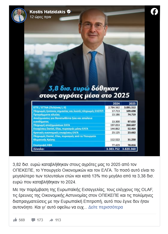 «3,82 δισ. ευρώ καταβλήθηκαν στους αγρότες μας το 2025 από τον ΟΠΕΚΕΠΕ, το Υπουργείο Οικονομικών και τον ΕΛΓΑ. Το ποσό αυτό είναι το μεγαλύτερο των τελευταίων ετών και κατά 13% πιο μεγάλο από τα 3,38 δισ. ευρώ που καταβλήθηκαν το 2024.