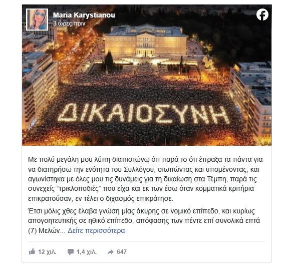 «Με πολύ μεγάλη μου λύπη διαπιστώνω ότι παρά το ότι έπραξα τα πάντα για να διατηρήσω την ενότητα του Συλλόγου, σιωπώντας και υπομένοντας, και αγωνίστηκα με όλες μου τις δυνάμεις για τη δικαίωση στα Τέμπη, παρά τις συνεχείς “τρικλοποδιές” που είχα και εκ των έσω όταν κομματικά κριτήρια επικρατούσαν, εν τέλει ο διχασμός επικράτησε.
