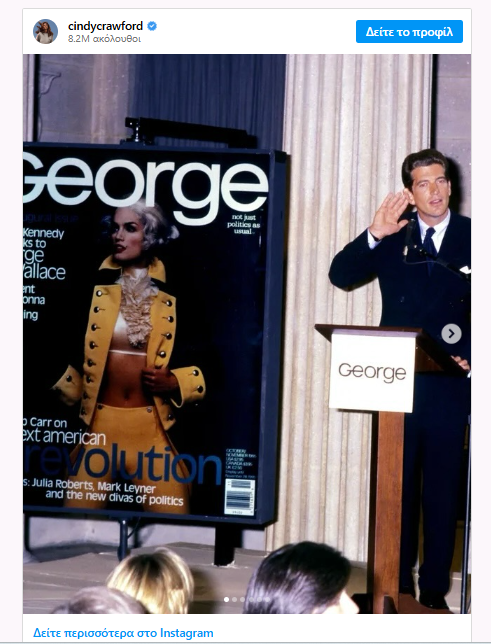 «Το 1995 — το πρώτο εξώφυλλο του περιοδικού George Magazine του Τζον Κένεντι Τζούνιορ, δια χειρός του μοναδικού [φωτογράφου] Χερμπ Ριτς. Όχι μόνο πολιτική», συνέχισε, αναφερόμενη στο εμβληματικό σλόγκαν του περιοδικού.
