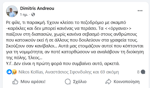 Ο δικηγόρος Δημήτρης Ανδρέου, σχολίασε αιχμηρά και ουσιαστικά εχθές, με δημόσια ανάρτησή του στο Facebook, κάποια από εκείνα που γίνονται στη Χαλκίδα εδώ και χρόνια, αλλά κανείς δεν ασχολήθηκε όπως θα έπρεπε.