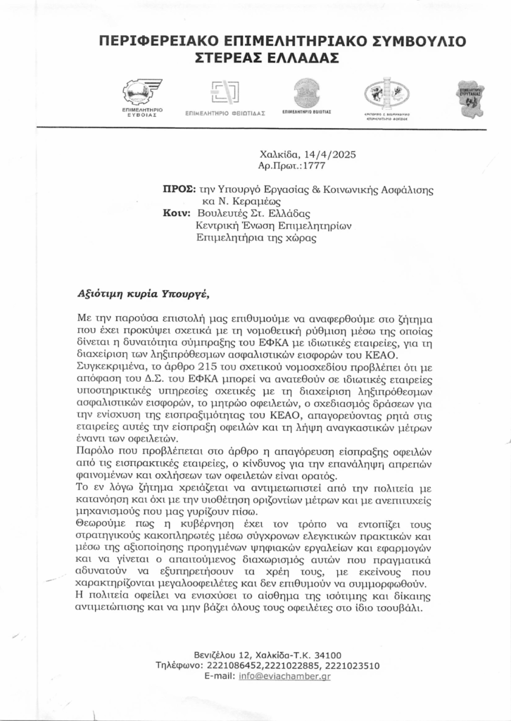 Το Περιφερειακό Επιμελητηριακό Συμβούλιο Στερεάς Ελλάδας, υπό την Προεδρία του κ. Γιάννη Γεροντίτη, απέστειλε επιστολή στην Υπουργό Εργασίας & Κοινωνικής Ασφάλισης κα Ν. Κεραμέως σχετικά με τη νομοθετική ρύθμιση μέσω της οποίας δίνεται η δυνατότητα σύμπραξης του ΕΦΚΑ με ιδιωτικές εταιρείες, για τη διαχείριση των ληξιπρόθεσμων ασφαλιστικών εισφορών του ΚΕΑΟ.