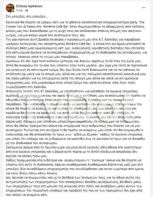 Ο κύριος Ιορδάνου προσήχθη στο ΑΤ Χαλκίδας το βράδυ της Παρασκευής, για παραβίαση του ωραρίου λειτουργίας του καταστήματος Boheme Cafe Bar στο κέντρο της Χαλκίδας.
