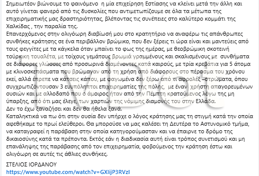 Καταληκτικά να πω ότι στην ουσία δεν υπήρχε ο λόγος κράτησης μας τη στιγμή κατά την οποία αφεθήκαμε το πρωί ελεύθεροι. Θα μπορούσε να μας καλέσει τη Δευτέρα το Αστυνομικό τμήμα, να καταγραφεί η παράβαση στην οποία κατηγορούμασταν και να έπαιρνε το δρόμο της δικαιοσύνης κατά τα πρέποντα. Εκτός εάν η διαδικασία αυτή είναι τρόπος συνετισμού και μη επανάληψης της παράβασης από τον επιχειρηματία, φοβούμενος την κράτηση έστω και ολιγόωρη σε αυτές τις άθλιες συνθήκες.