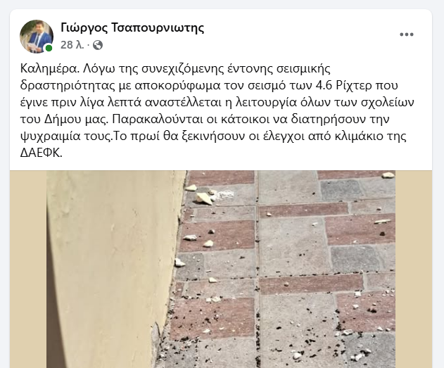 Καλημέρα. Λόγω της συνεχιζόμενης έντονης σεισμικής δραστηριότητας με αποκορύφωμα τον σεισμό των 4.6 Ρίχτερ που έγινε πριν λίγα λεπτά αναστέλλεται η λειτουργία όλων των σχολείων του Δήμου μας. Παρακαλούνται οι κάτοικοι να διατηρήσουν την ψυχραιμία τους.Το πρωί θα ξεκινήσουν οι έλεγχοι από κλιμάκιο της ΔΑΕΦΚ.