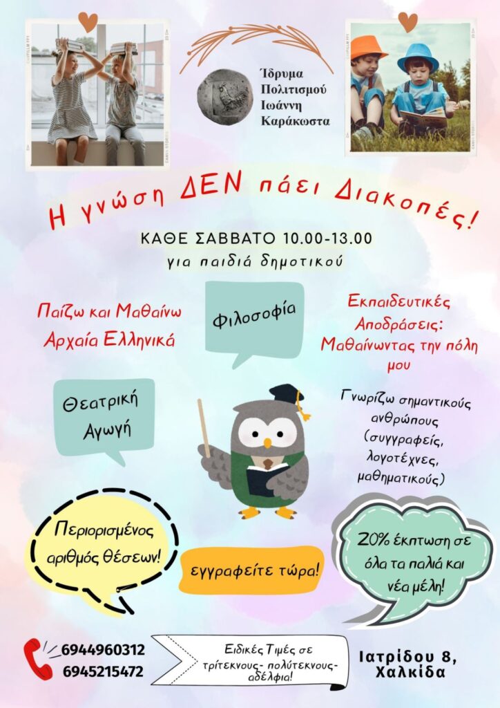 Ξεκινάμε ένα 3ωρο πρωτοποριακό πρόγραμμα για παιδιά Δημοτικού! Κάθε Σάββατο στο κέντρο της πόλης, στο Ίδρυμα Πολιτισμού Ιωάννη Καράκωστα (Ιατρίδου 8, Χαλκίδα).