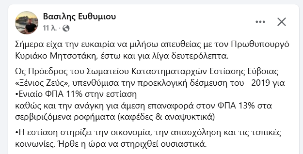 Ως Πρόεδρος του Σωματείου Καταστηματαρχών Εστίασης Εύβοιας «Ξένιος Ζεύς», υπενθύμισα την προεκλογική δέσμευση του 2019 για