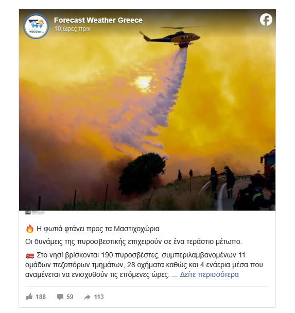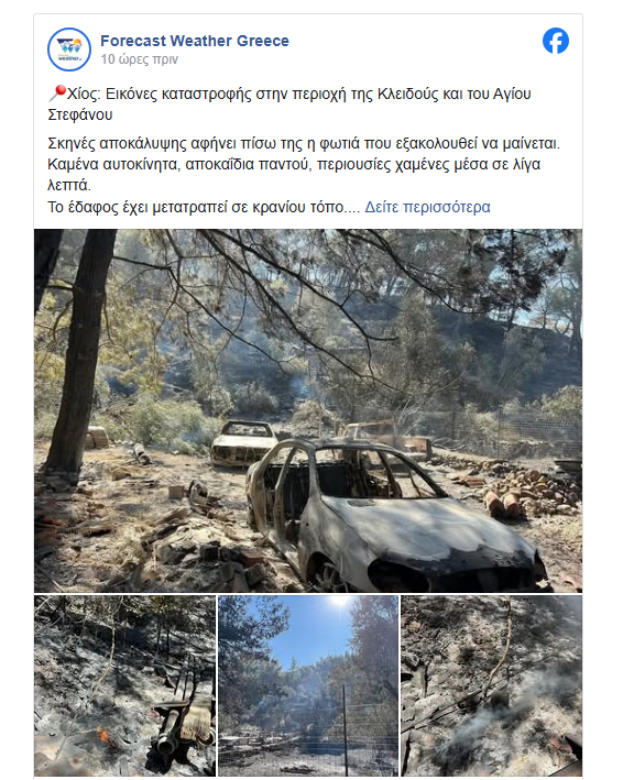 «Από το απόγευμα της Κυριακής, 22 Ιουνίου 2025, τρεις εστίες φωτιάς έχουν ξεσπάσει στη Χίο και εξαπλώνονται σε ολόκληρο το νησί εξαιτίας των ισχυρών ανέμων. Τις τελευταίες ώρες, παρά τις γενναίες προσπάθειες του πυροσβεστικού σώματος, οι φωτιές αναζωπυρώνονται με αποτέλεσμα 17 οικισμοί να έχουν εκκενωθεί για λόγους ασφαλείας και πολλές περιοχές του νησιού να μην έχουν ρεύμα και πρόσβαση σε βασικά αγαθά. Σύμφωνα με ανακοίνωση του Υπουργείου Κλιματικής Κρίσης και Πολιτικής Προστασίας, το τελευταίο 48ωρο στην Ελλάδα οι πυροσβεστικές δυνάμεις κλήθηκαν να αντιμετωπίσουν 110 πυρκαγιές σε διάφορες περιοχές της χώρας.